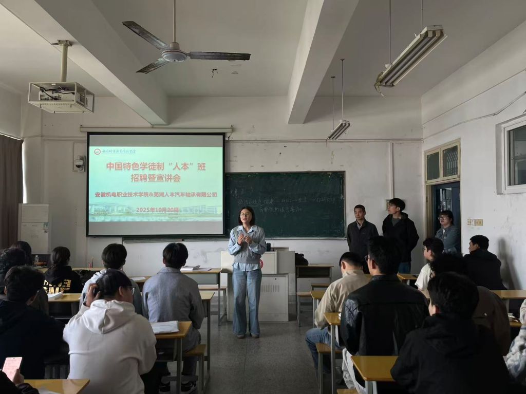 为深化产教融合、推进中国特色学徒制人才培养模式落地,搭建企业与学生双向选择的优质平台,10月20日,汽车零部件智能制造现代产业学院合作企业——芜湖人本汽车轴承有限公司,面向数控技术、机械设计与制造、机械制造及自动化等专业学生,举办中国特色学徒制“人本”班专场招聘暨宣讲会。
