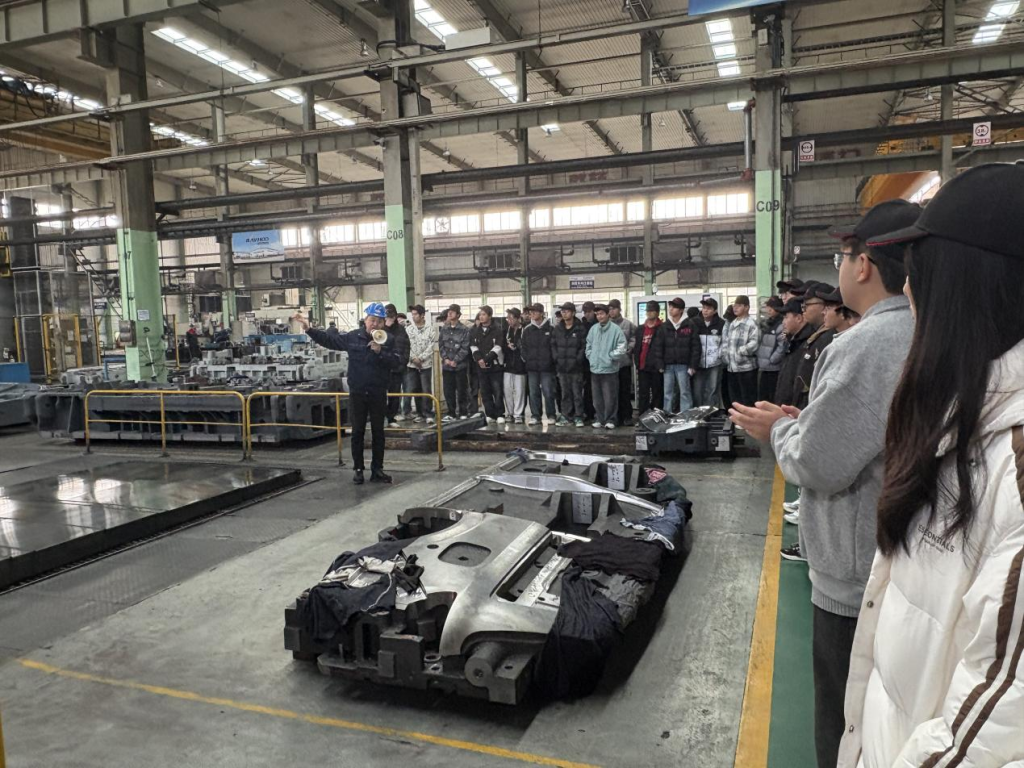 在埃夫特智能机器人股份有限公司,同学们深入了解了工业机器人从研发设计到集成应用的全过程。企业技术人员详细讲解了机器人在焊接、搬运、喷涂等场景下的高效解决方案,并展示了其协作机器人及柔性自动化产线的先进性能。同学们对智能机器人的精密控制与广泛适用性赞叹不已,深刻体会到自动化、智能化技术对现代制造业转型升级的核心驱动作用。瑞鹄汽车模具股份有限公司,同学们被高度精密、结构复杂的汽车覆盖件模具所吸引。讲解员讲解了汽车模具从数字化设计、精细化加工到试模验证的完整链条,展示了企业在轻量化车身模具、多材料成型模具等方面的领先技术。同学们直观感受到了模具作为“工业之母”在汽车制造业中的关键地位,以及数字化、智能化设计制造技术的深度融合。
